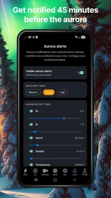 S AuroraNowom više nikada nećete propustiti priliku. Aplikacija vam šalje obavijesti u stvarnom vremenu kada se aktivnost pojača, prikazuje vam trenutni KP indeks i vjerojatnost vidljivosti za vašu točnu lokaciju i diljem svijeta. Detaljni podaci o solarnom vjetru i geomagnetskim uvjetima, uključujući Bz, brzinu i gustoću, pružaju vam dubinski uvid u čimbenike koji utječu na prikaz aurore.