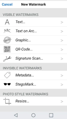 iWatermark+ nudi impresivan izbor od sedam vrsta vodenih žigova, uključujući pet vidljivih i dva diskretna, nevidljiva. Izrazite se tekstualnim žigom prilagodljivog fonta, boje, kuta i prozirnosti, upotrijebite zakrivljeni tekst ili pak svoj logotip. Možete skenirati svoj potpis za autentičan pečat ili generirati QR kod koji može sadržavati do 4000 znakova informacija. Za nevidljivu zaštitu, tu su meta podaci (IPTC/EXIF) i steganografski žigovi koji skrivaju informacije unutar samih piksela fotografije. Svi se žigovi mogu kombinirati i istovremeno primijeniti na jednu ili više fotografija u paketu.