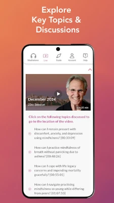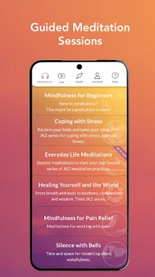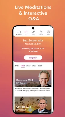 Što ovu aplikaciju čini jedinstvenom? Pristupite izravnim vođenim meditacijama s Jon Kabat-Zinnom uživo, uključujući šest ekskluzivnih događaja s pitanjima i odgovorima planiranih za 2025. godinu. Propustili ste sesiju? Nema problema! Snimke su dostupne na zahtjev, precizno označene s pitanjima sudionika za jednostavno pronalaženje relevantnih dijelova. Započnite s četiri besplatne vođene meditacije, uključujući Jonov poznati 45-minutni Body Scan, i istražite praksu inspiriranu Metodom smanjenja stresa temeljenom na svjesnosti (MBSR), koju je sam Jon Kabat-Zinn razvio. Uživajte u opsežnoj biblioteci vježbi koje se mogu prilagoditi vašem rasporedu – od kratkih do dugih meditacija – omogućujući vam da vježbate bilo kada i bilo gdje.